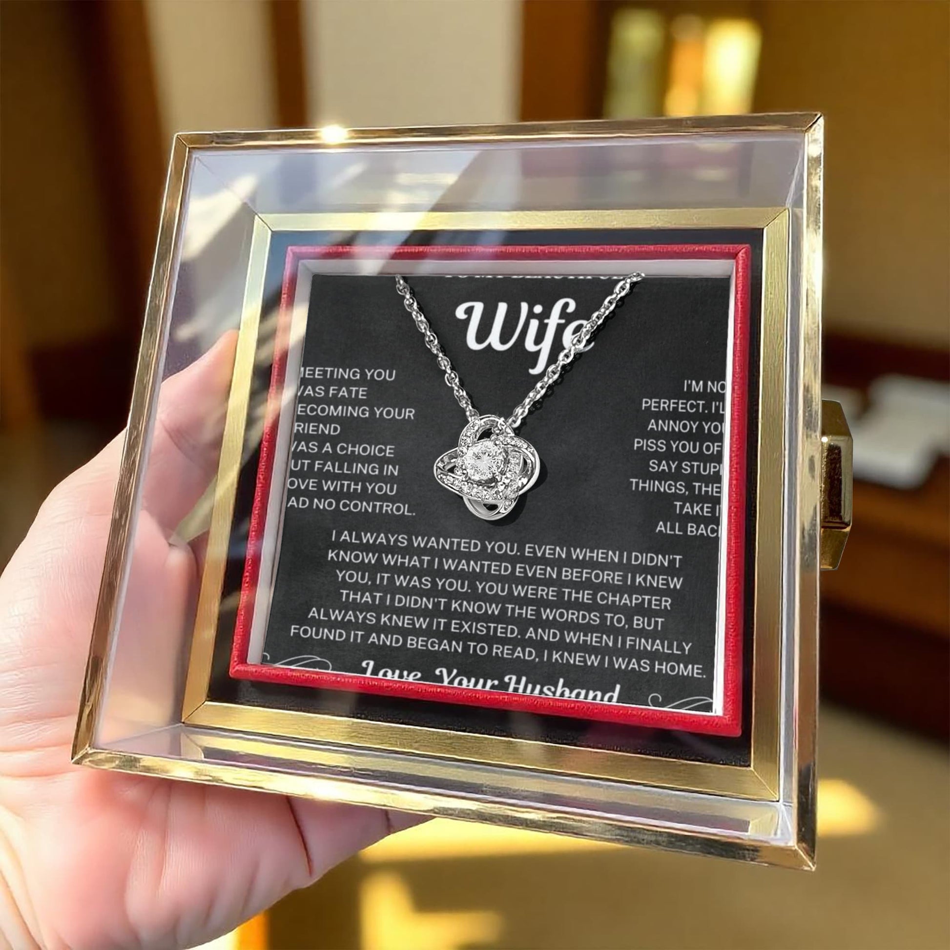 Imagine her reaction as she receives this beautiful Love Knot Necklace. Representing an unbreakable bond between two souls, this stunning pendant is adorned with premium cubic zirconia crystals, making it a timeless symbol of love and devotion. The luxurious box, featuring a meticulously preserved rose that never fades, adds an extra touch of love. With a simple turn of the gold knob, her breathtaking gift is revealed—making it the perfect sentimental gift for that special someone.