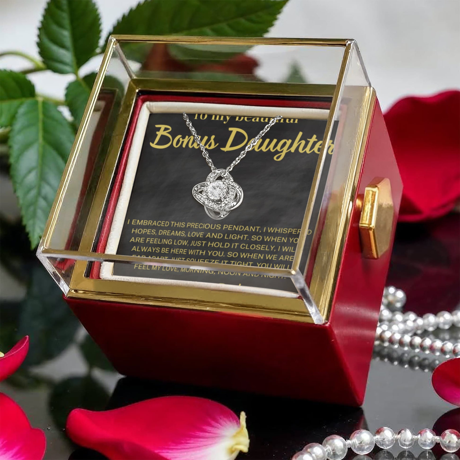 Imagine her reaction as she receives this beautiful Love Knot Necklace. Representing an unbreakable bond between two souls, this stunning pendant is adorned with premium cubic zirconia crystals, making it a timeless symbol of love and devotion. The luxurious box, featuring a meticulously preserved rose that never fades, adds an extra touch of love. With a simple turn of the gold knob, her breathtaking gift is revealed—making it the perfect sentimental gift for that special someone.
