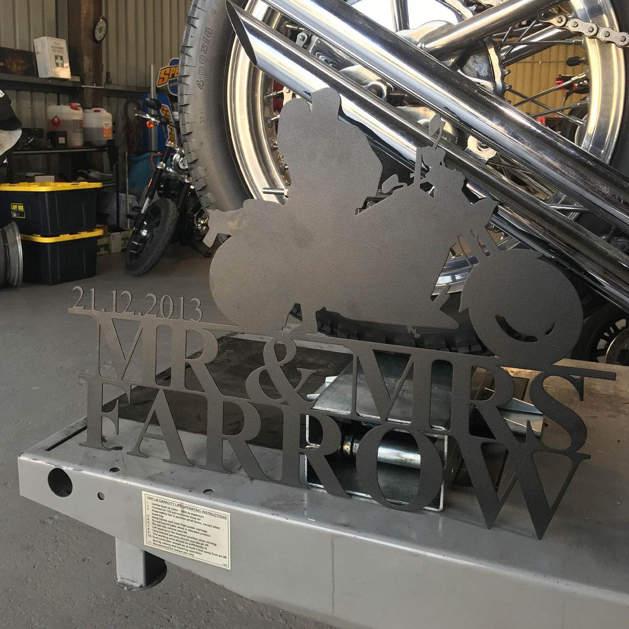 The sign features a sleek, brushed metal finish with intricate motorcycle-themed artwork, beautifully etched to showcase your commitment to adventure and each other. Personalize it with your names and a special date to make it uniquely yours.