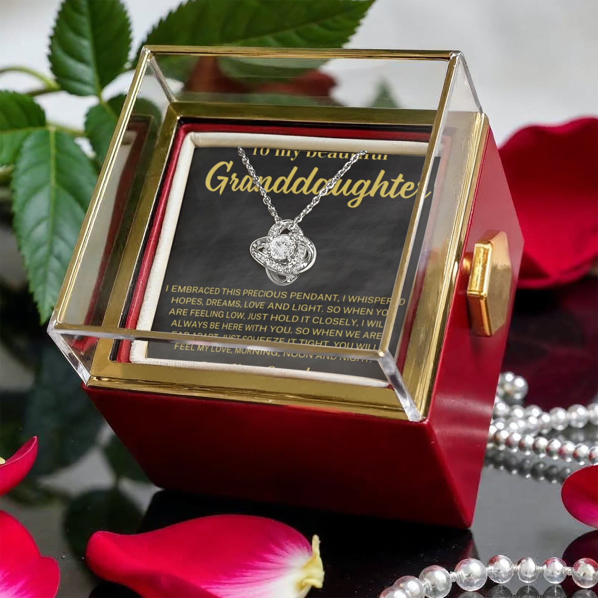 Imagine her reaction as she receives this beautiful Love Knot Necklace. Representing an unbreakable bond between two souls, this stunning pendant is adorned with premium cubic zirconia crystals, making it a timeless symbol of love and devotion. The luxurious box, featuring a meticulously preserved rose that never fades, adds an extra touch of love. With a simple turn of the gold knob, her breathtaking gift is revealed—making it the perfect sentimental gift for that special someone.