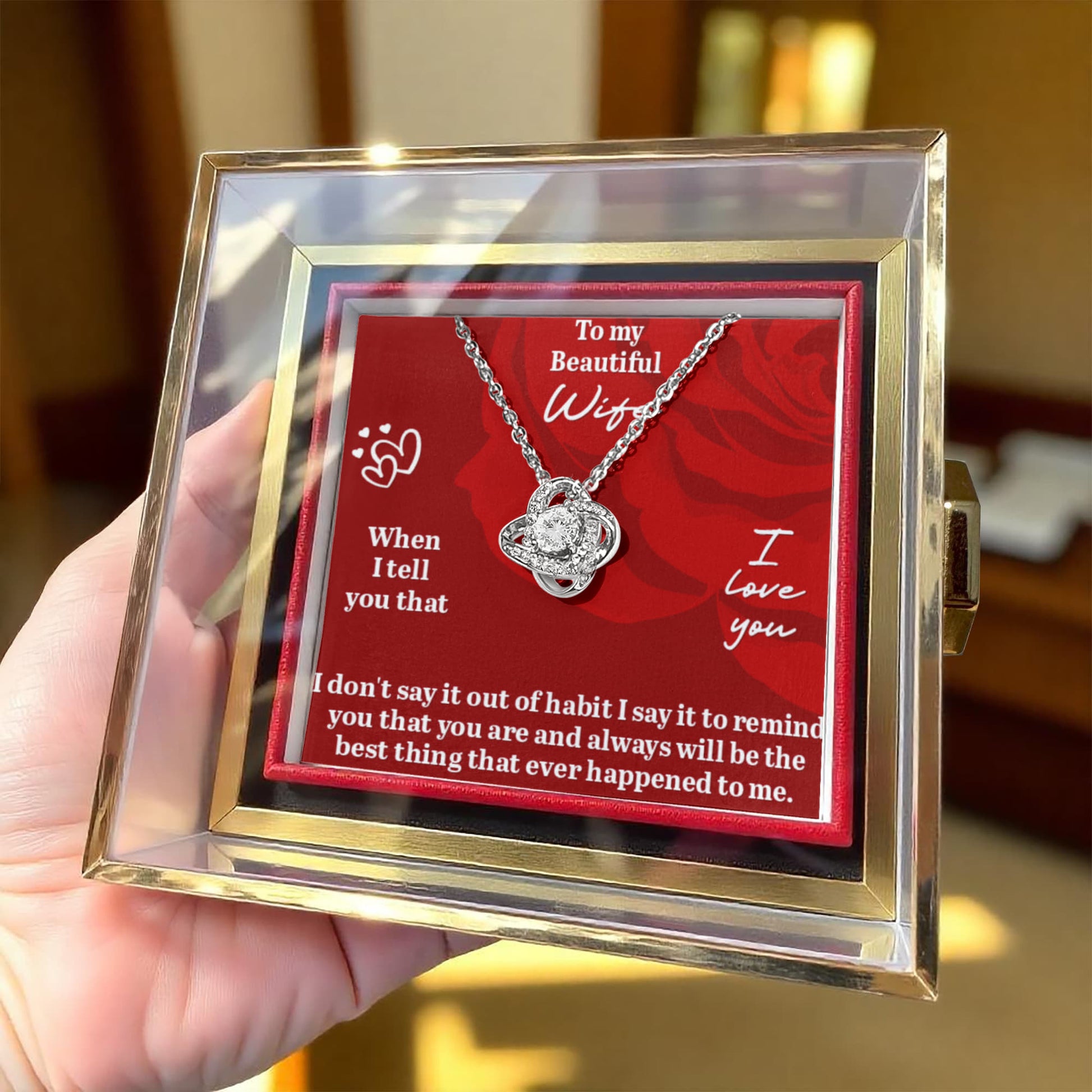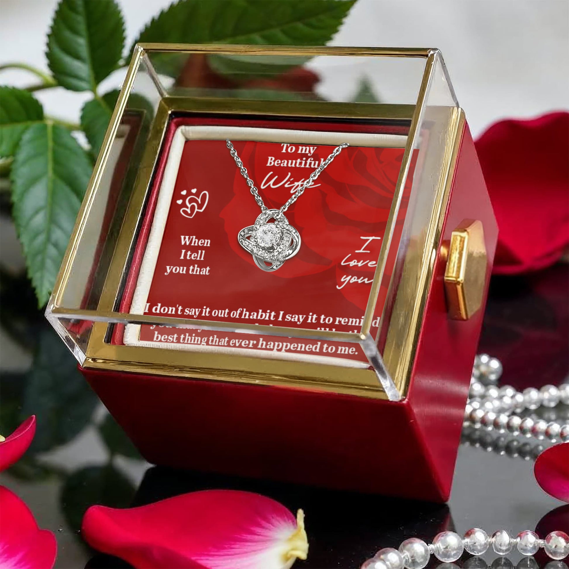 Imagine her reaction as she receives this beautiful Love Knot Necklace. Representing an unbreakable bond between two souls, this stunning pendant is adorned with premium cubic zirconia crystals, making it a timeless symbol of love and devotion. The luxurious box, featuring a meticulously preserved rose that never fades, adds an extra touch of love. With a simple turn of the gold knob, her breathtaking gift is revealed—making it the perfect sentimental gift for that special someone.