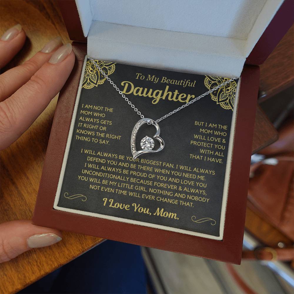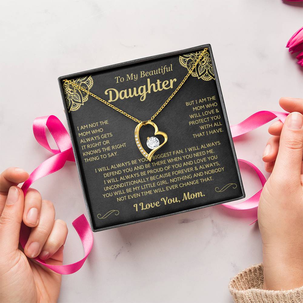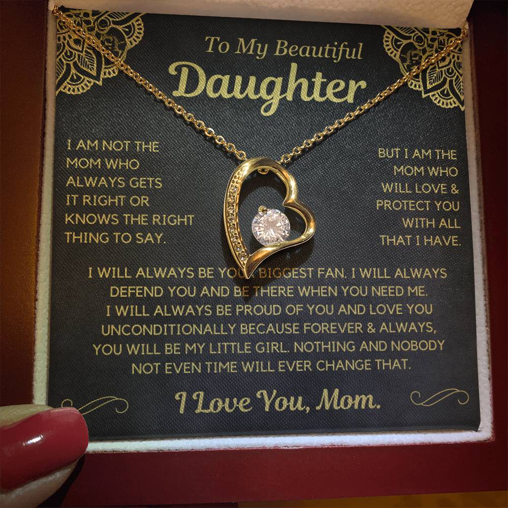 I am not the Mom who always gets it right or knows the right thing to say. But I am the Mom who will love & protect you with all that I have. I will always be your biggest fan. I will always defend and be there when you need me. I will always be proud of you and love you unconditionally because forever and always you will be my little girl. Nothing and nobody, not even time, will ever change that. Love, Mom.